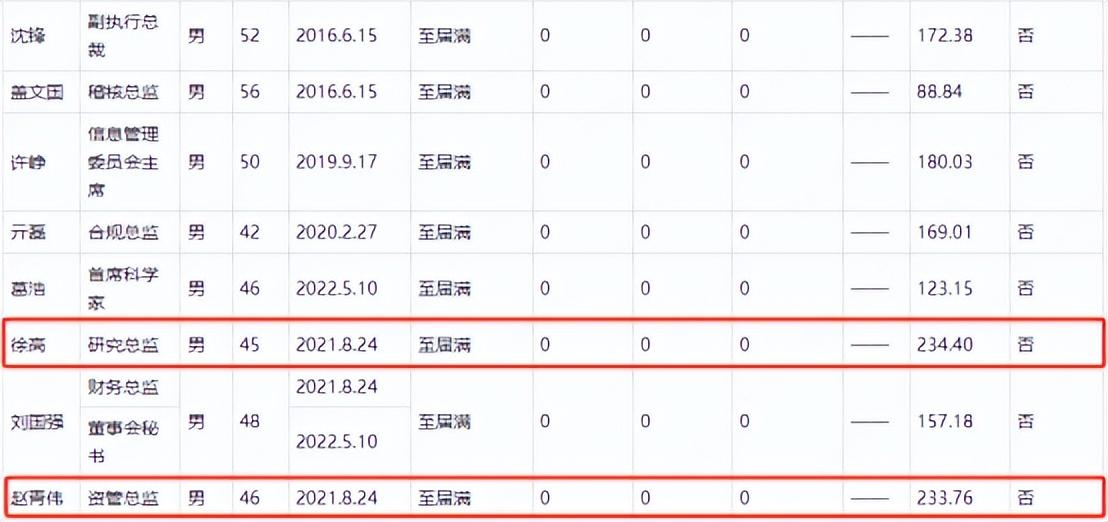 中银证券2022年年报显示,宁敏在中银证券的薪酬为219.21万,没有公司研究总监徐高和资管总监赵青伟高,赵青伟年度薪酬是233.76万元。