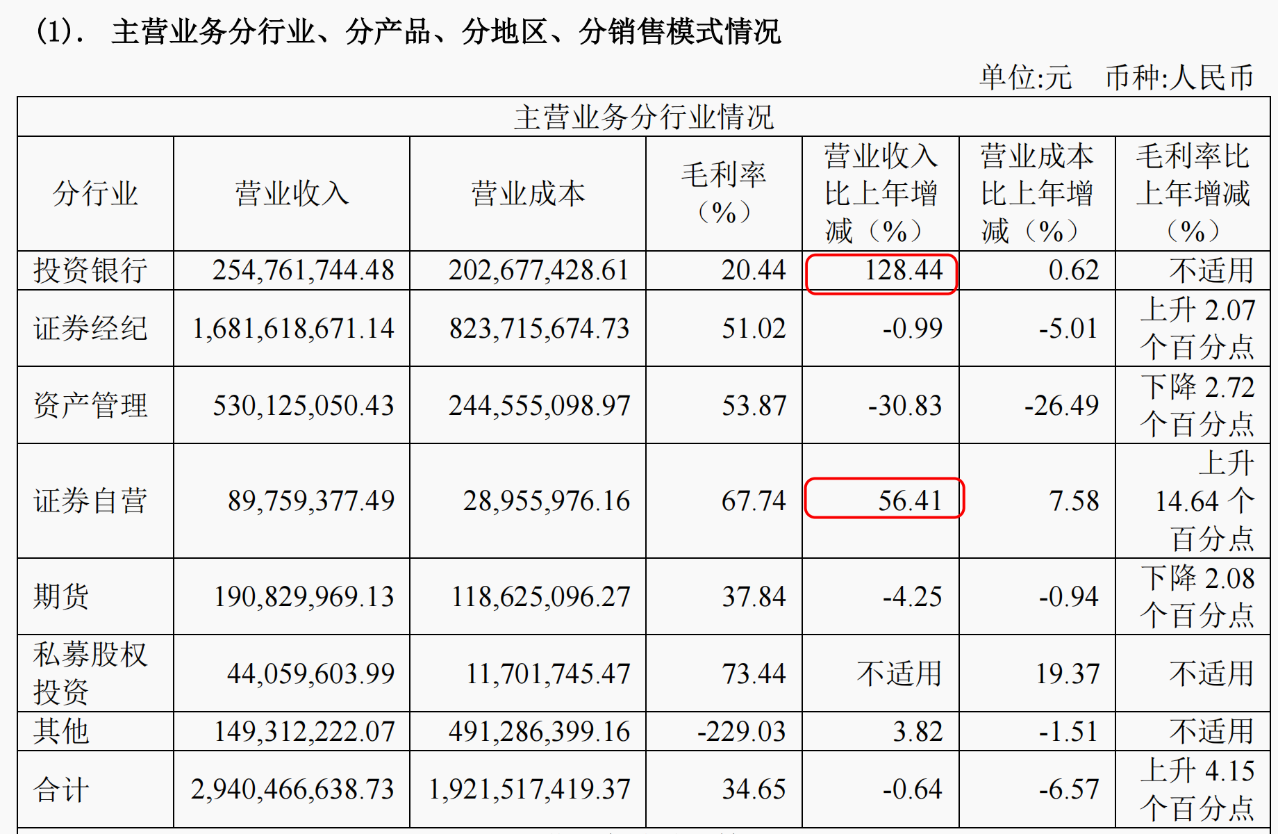 从主营业务来看,在2023年29.40亿元的营业收入中,证券经纪业务收入16.82亿元,同比微降0.99%,营收占比57.19%,毛利率提升2.07%;资产管理业务收入5.30亿元,同比大幅减少30.83%,营收占比18.03%,毛利率减少2.72%;投资银行业务收入2.55亿元,同比大增128.44%,营收占比8.66%;证券自营业务0.90亿元,营收占比不大,但同比增速高达56.41%。