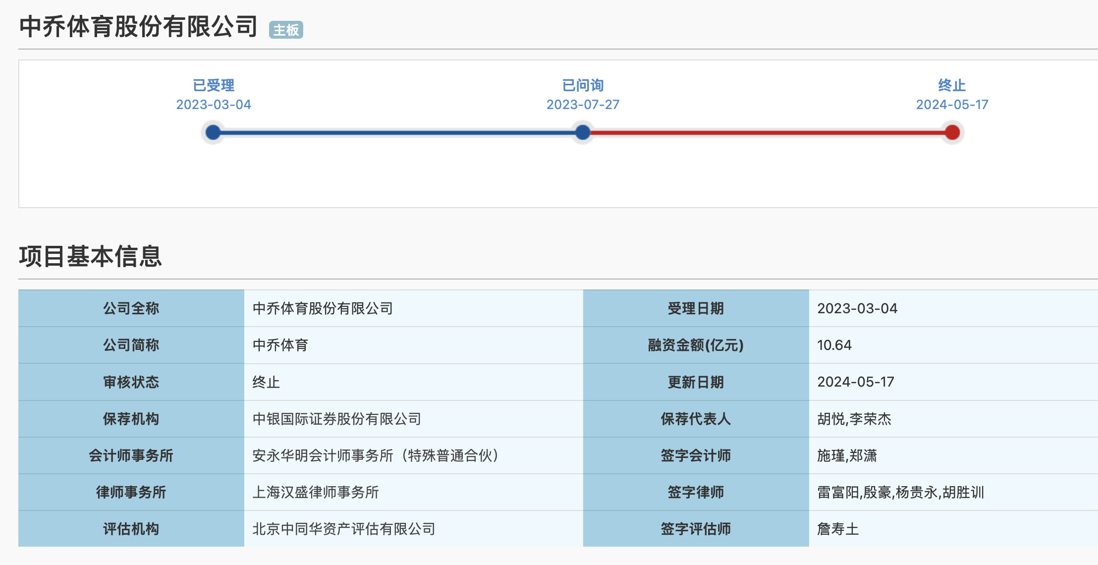 2024年5月17日,据上海证券交易所官网,由中银证券保荐的中乔体育股份有限公司宣布终止在主板上市的申请。中乔体育于2023年3月4日递交申报稿,原拟在上交所主板公开发行股票不少于5,000万股,但不超过11,250万股;拟募资10.64亿元,用于鞋生产基地扩建项目、研发设计中心建设项目、全国战略直营店建设项目、信息化建设项目。
