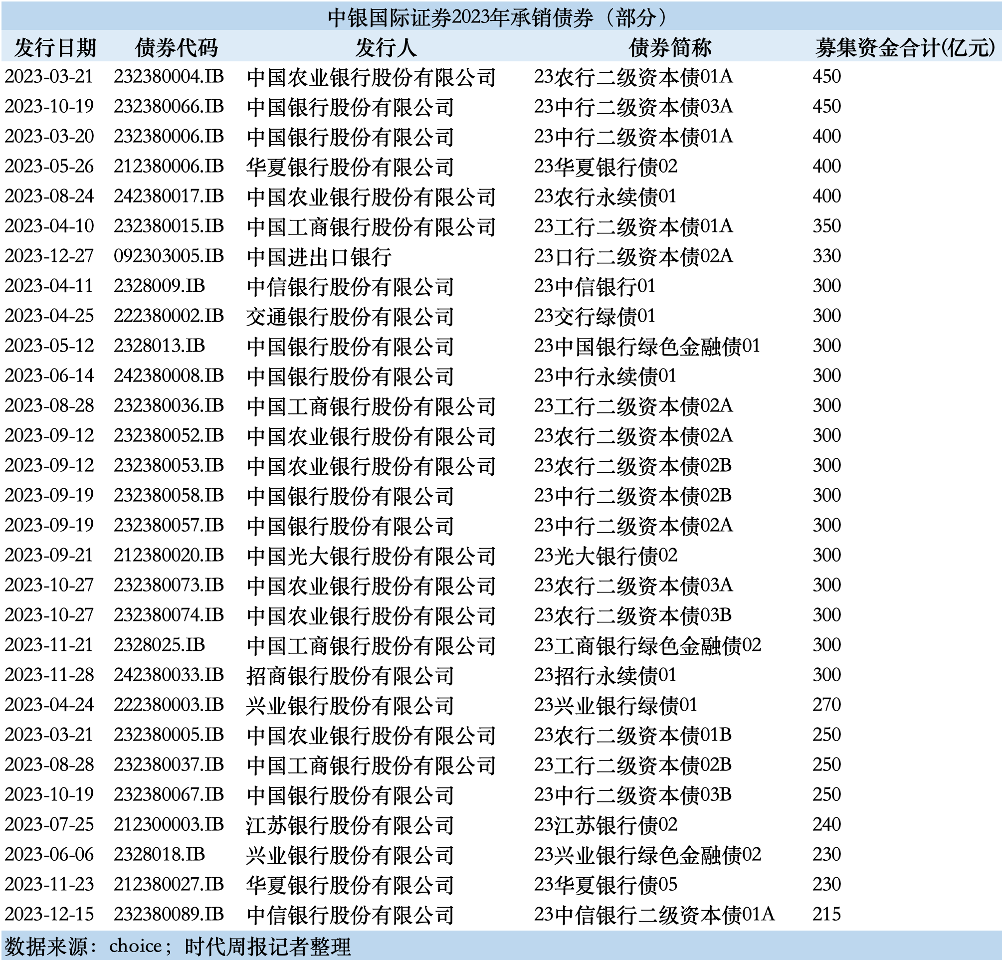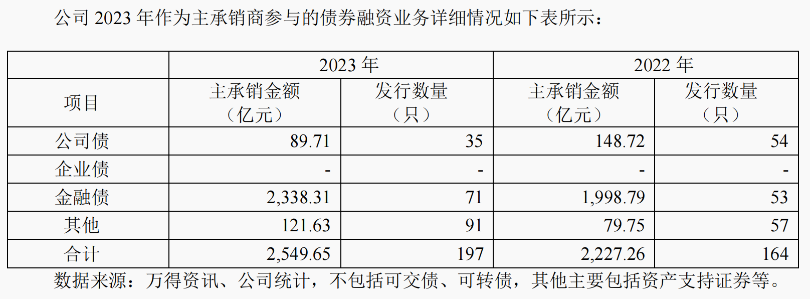 2023年中银证券承销金融债2338.31亿元,同比增加17%,比2022年增加了322.39亿元,据公司披露,位居行业第4名。