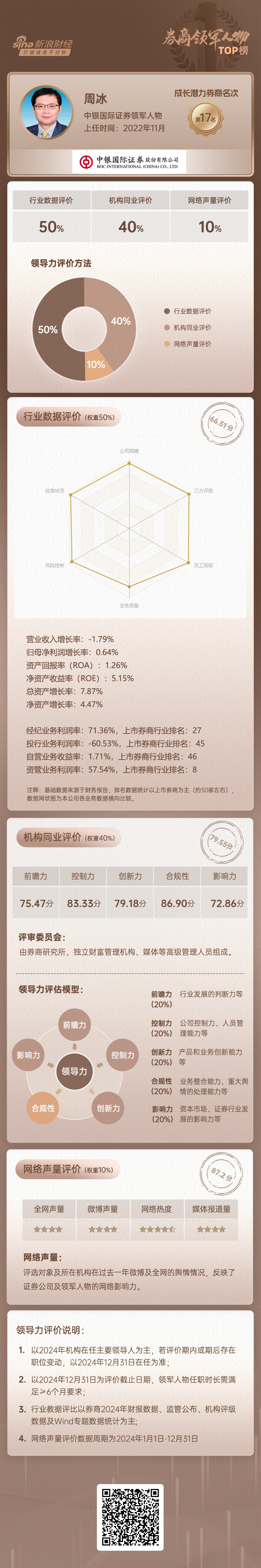 “上市券商领军人物领导力TOP榜”由新浪财经发起,旨在表彰各大券商领军人物的卓越贡献与深远影响力。该榜单盘点最近一个完整年度的券商领袖管理成就,以行业数据、同业评价、网络声量多维度综合评价体系为基础,以创造经济与社会价值为核心标准,表彰杰出领袖,助力金融行业持续健康发展。