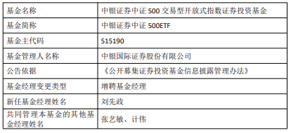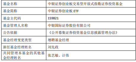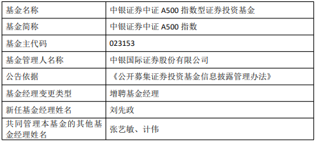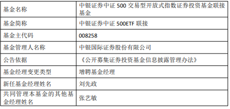 中国经济网北京8月19日讯今日,中银国际证券股份有限公司公告,中银证券中证500ETF、中银证券创业板ETF、中银证券中证A500指数、中银证券中证500ETF联接增聘刘先政。