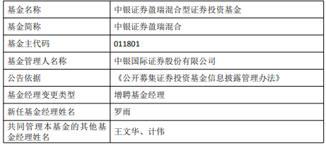 中国经济网北京8月19日讯今日,中银国际证券股份有限公司公告,中银证券盈瑞混合增聘罗雨。