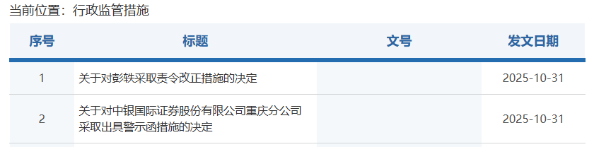 2025年5月,江西证监局对中银证券赣州营业部经纪人郭清平发出警示,因其超范围推介非公司提供的投资信息及发行或代销的金融产品信息。同月,新疆证监局也对中银证券乌鲁木齐东风路营业部的从业人员朱丽开出罚单,因其控制使用他人证券账户进行股票交易,被处以5万元罚款。
