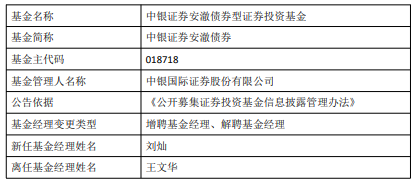 今日,中银国际证券股份有限公司公告,中银证券安澈债券增聘刘灿,王文华离任。
