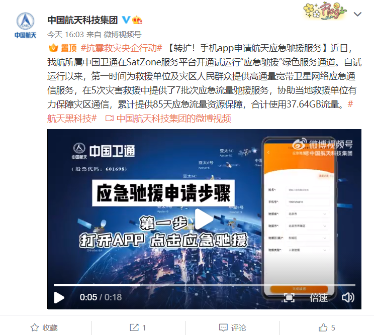 中国卫通称,自试运行以来,在 5 次灾害救援中,提供了 7 批次应急流量驰援服务,协助当地救援单位的保障灾区通信,累计提供 85 天应急流量资源保障,合计使用 37.64GB 流量。