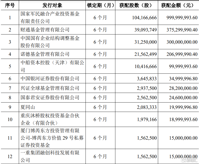 格隆汇10月14日丨中国卫通(601698.SH)公布非公开发行股票发行情况报告书,此次非公开发行股票的发行价格为9.60元/股,发行股份数量约2.24亿股,募集资金总额约21.54亿元。此次发行对象最终确定为13家,最终配售情况如下: