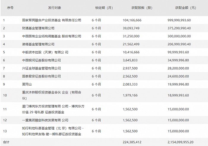 中国卫通10月14日发布非公开发行股票发行情况报告书,此次非公开发行股票的发行价格为9.6元/股,发行股份数量约2.24亿股,实际募集资金总额约21.54亿元。此次发行对象最终确定为13家,财通基金、诺德基金及银河证券等参投。