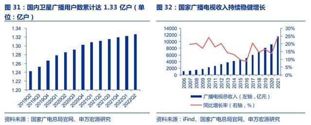 根据国家广电总局披露数据,截至 2021 年底,国家广播电视业务营收首次突破万亿达 1.15 万亿元,卫星广播用户群体不断扩大,截至 2022Q2,卫星广播用户累计达 1.33 亿户。根据《广播电视和网络视听“十四五”科技发展规划》内容,预计到 2025 年我国超高清视频标准体系基本完善;地市级以上和较发达县级广播电视播出机构基本实现高清化,4K 超高清频道开办 20 个以上;主要网络视听机构视频服务全部高清化,具备 4K 超高清视频播出能力探索直播卫星与互联网电视融合发展模式,开展 4K 超高清电视直播卫星传输试验,开展 Ka 频段卫星广播试验,卫星广播市场潜力巨大。