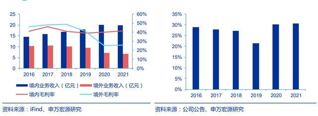 2018-2021 年,境内业务占比从 58.4%增长至 74.9%,营收占比持续提升,毛利率稳中有进,始终保持在 40%以上。
