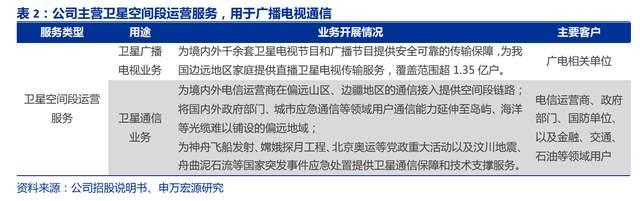 1)公司主营卫星空间段运营业务,通过投资、建设和运营通信广播卫星及配套地面测控和监测系统,为用户提供广播电视、通信、视频、数据等传输服务。