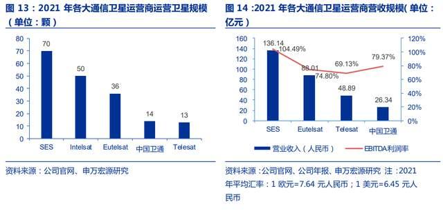 从国际市场来看,由于通信卫星运营行业是资本密集型,存在产业集聚情况。根据前瞻产业研究院数据显示,截至 2021 年底全球共有 40 余家主要固定通信卫星运营商,其中按业务收入规模进行排名,前三位分别是 SES、Eutelsat、Telesat,2021 年营收分别为 136、88 和 49 亿元,在行业中占有较大优势。
