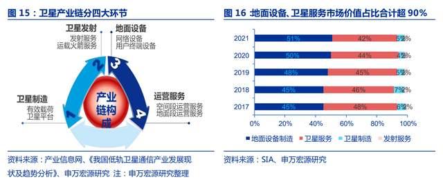 2021 年,美国卫星产业协会(SIA)发布的关于全球卫星产业规模数据显示,卫星产业链中卫星制造、发射、地面设备和通信运营占总市场规模的比例,分别为 5%、2%、51%和 42%,上游与中下游市场规模比接近 1:9。