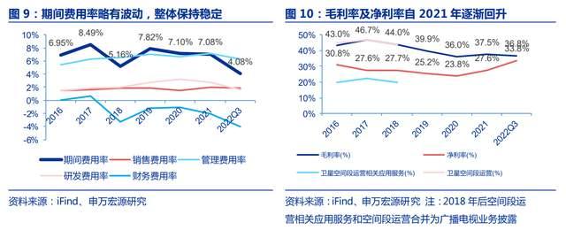 公司及境外下属子公司亚太卫星存在较大的外币货币性项目,汇兑损益导致财务费用率波动较为明显。排除财务费用率影响,2016-2022H1 公司销售费用率、管理费用率和研发费用率之和维持 10%左右,保持大体稳定。