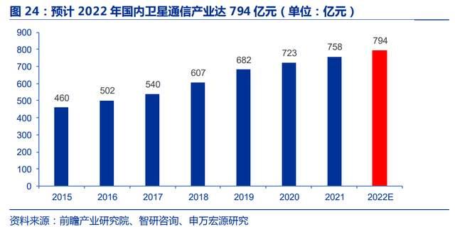 根据前瞻产业研究院数据显示,2015-2021 年,我国卫星通信产业总产值 CAGR 为 8.7%,2021 年同比增速为 4.8%。假设卫星通信产业增速维持 4.8%,根据前文 SIA 数据,预计 2022 年产业总产值达 794 亿元。