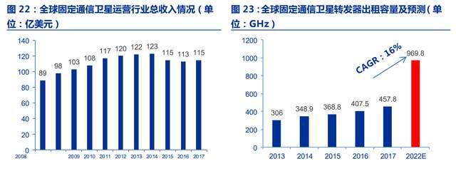 据 Euroconsult 数据显示,截至 2017 年全球固定通信卫星转发器出租容量为 457.8Ghz,固定通信卫星运营行业规模为 115 亿美元,预计 2022 年,全球卫星转发器出租容量为 969.8GHz。