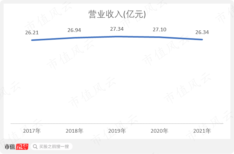 受境外业务的拖累,公司营收几乎就是一条水平直线。2021年的营收为26.34亿元,相比2017年几乎增长为0。