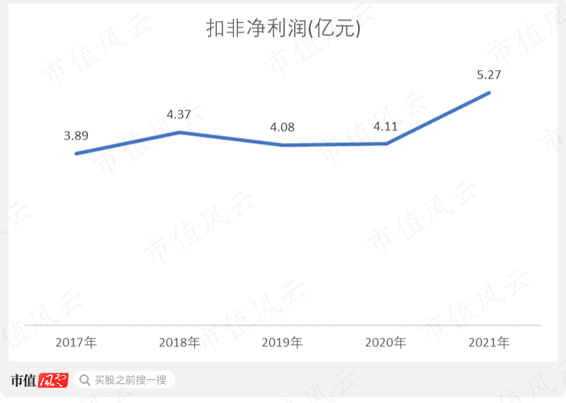 公司的盈利能力有所提高,所以扣非净利润总体上是增长的,从2017年的3.89亿元增长至2021年的5.27亿元,期间CAGR为8%,属于低速增长。