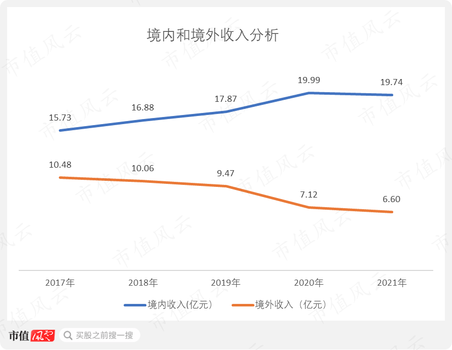 境外业务的毛利率不仅下滑,甚至其整体收入都在萎缩。境外收入从2017年的10.48亿元逐年减少至2021年的6.6亿元。同期境内收入则从15.73亿元增长到19.74亿元。