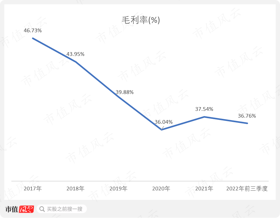 公司毛利率从2017年的46.73%下降至2022年前三季度的36.76%,下降了近10个百分点。