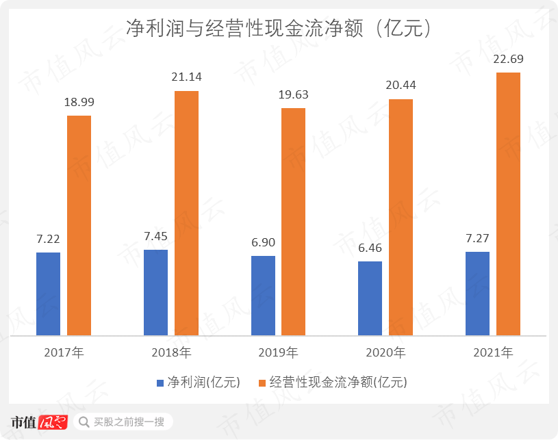 如果考虑资本性开支,现金流也还可以。从2018年开始,自由现金流均为正值。其中2018和2021年,自由现金流均流入9亿元以上。