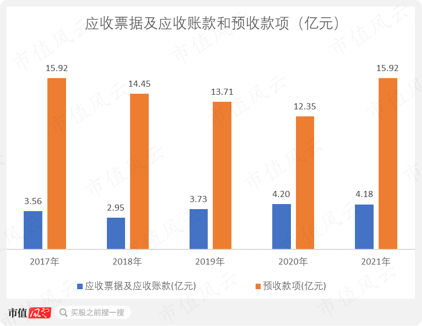 2017-2021年,预收款项长期保持在10亿元以上,最高接近16亿元,而同期的应收票据及应收账款不到5亿元。