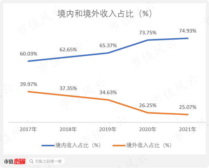 2017-2021年,境外收入占比从39.97%一路下降至25.07%,同期境内收入占比则从60.03%逐渐提升至74.93%。公司是越来越依赖境内市场了。