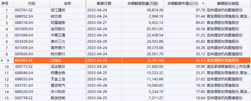 4月24日,中国卫通开盘跌停。消息面上,中国卫通今日2.24亿股限售股份解禁上市,按上周五收盘价计算解禁市值51.25亿元。Choice数据统计,本周9只个股解禁市值超过30亿元,包括浙江建投、纳芯微、财富趋势、金田股份等。