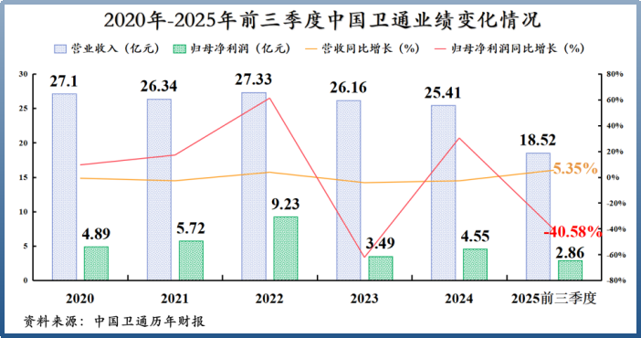 更令人担忧的是2025年前三季度的“增收不增利”:营收微增,净利润却近乎腰斩。这背后,是商业航天大潮下,中国卫通传统商业模式遭遇的根本性质疑。