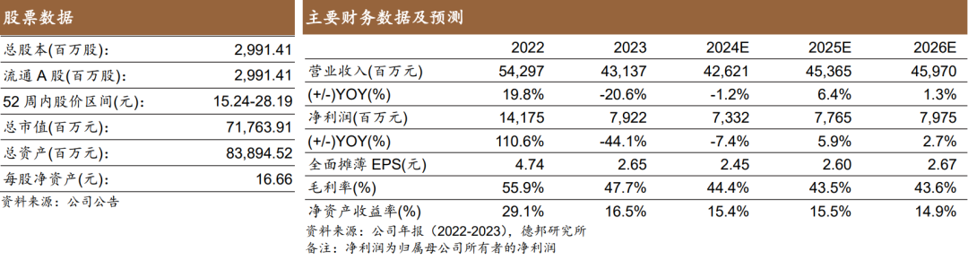 盈利预测:我们预计公司2024-2026归母净利润分别为73.3/77.7/79.8亿元,EPS分别为2.45/2.60 /2.67元,PE分别为9.79/9.24/9.00倍。