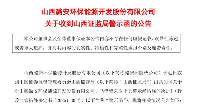 这是潞安环能继今年5月因控股公司环境违规被罚后,年内第二次因合规问题被监管点名。而此次违规的矛头,更直接指向公司治理核心——董事会秘书马泽锋被认定负主要责任,监管措施将永久记入证券期货市场诚信档案。