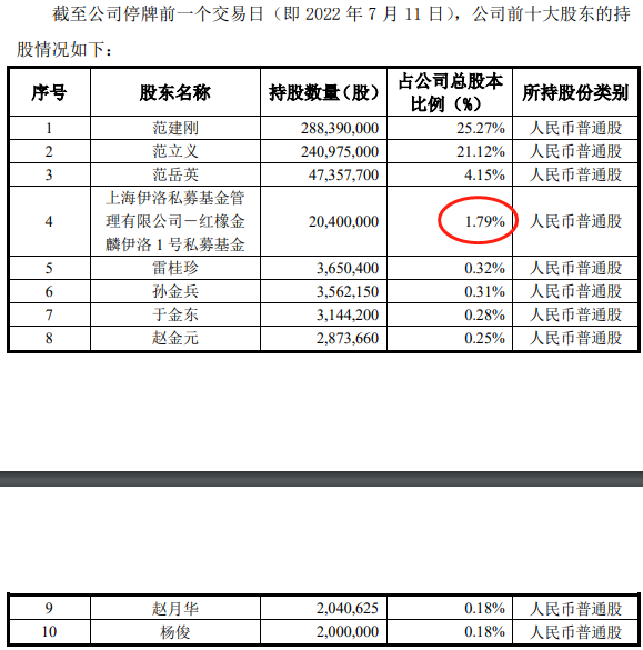 风范股份7月26日公告显示,截至公司停牌前一个交易日(即2022年7月11日),上海伊洛持有风范股份2040万股,持股比例为1.79%,为风范股份第4大股东,同时也是公司第4大流通股股东。