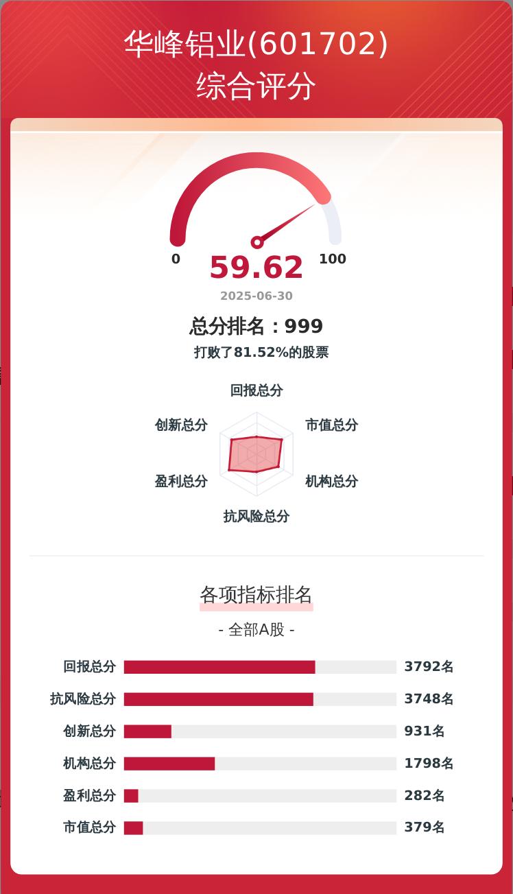 华峰铝业在多个评估维度中表现各异,其中盈利能力和创新方面得分较高,分别为15.04分和9.54分,显示出该公司较强的财务健康度和创新能力;而在回报、抗风险及机构认可度方面则表现一般,得分分别为6.58分、6.73分和10.73分;市值维度得分为11分,表明市场对其整体价值的认可度尚可。综合来看,华峰铝业在保持良好盈利能力的同时,在其他领域仍有提升空间。