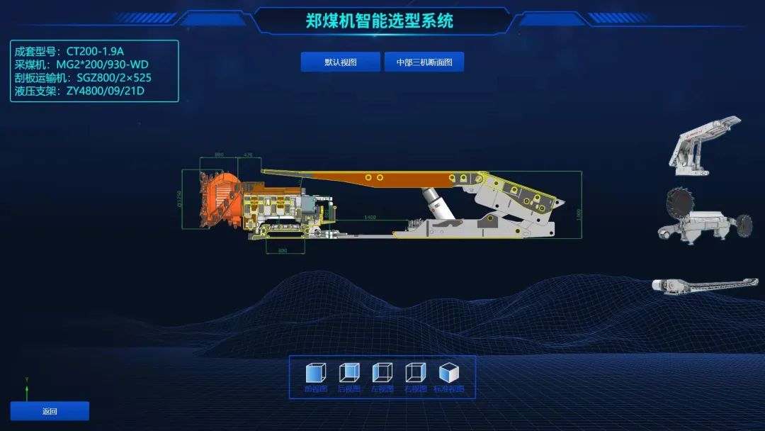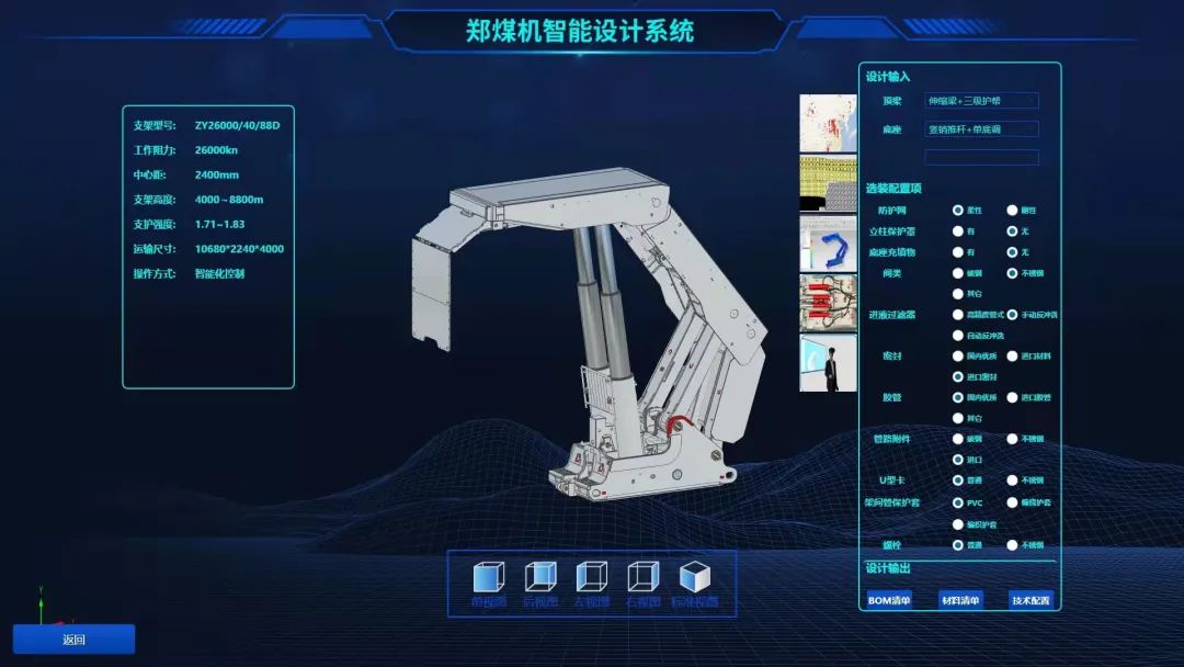 依托郑煤机强大数据库资源,输入矿井位置、煤层厚度、支架中心距及工作面长度等主要参数,1分钟即可实现一键选型、一键三维配套展示及一键方案生成。