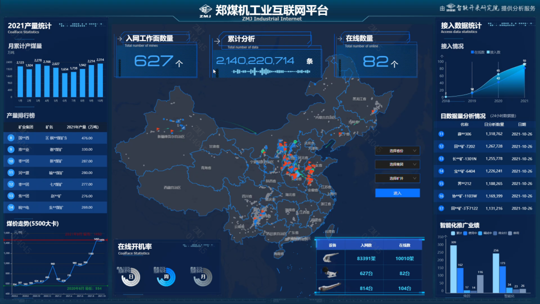 郑煤机自主开发工业互联网平台,可接入各类设备数据和现场视频,通过智能图表,准确高效的呈现生产和安全数据,省去人工填报和加工等复杂流程。兼有智能管控平台APP,能展现实时的生产情况和设备工况,故障分析,并具备日常信息填报,工作流程管理等办公类功能模块。