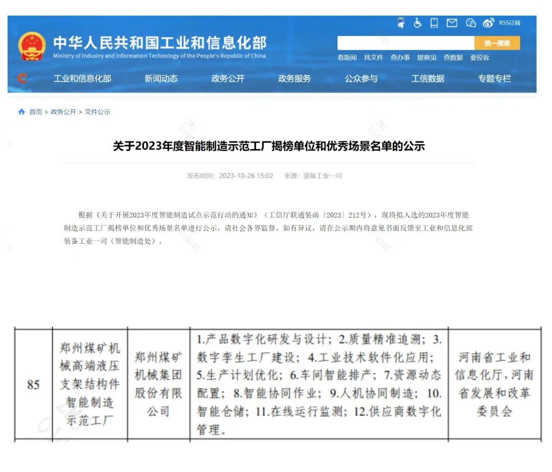 10月26日,工业和信息化部发布了《关于2023年度智能制造示范工厂揭榜单位和优秀场景名单的公示》,郑煤机集团入选2023年度智能制造示范工厂揭榜单位,河南省仅5家单位入选。