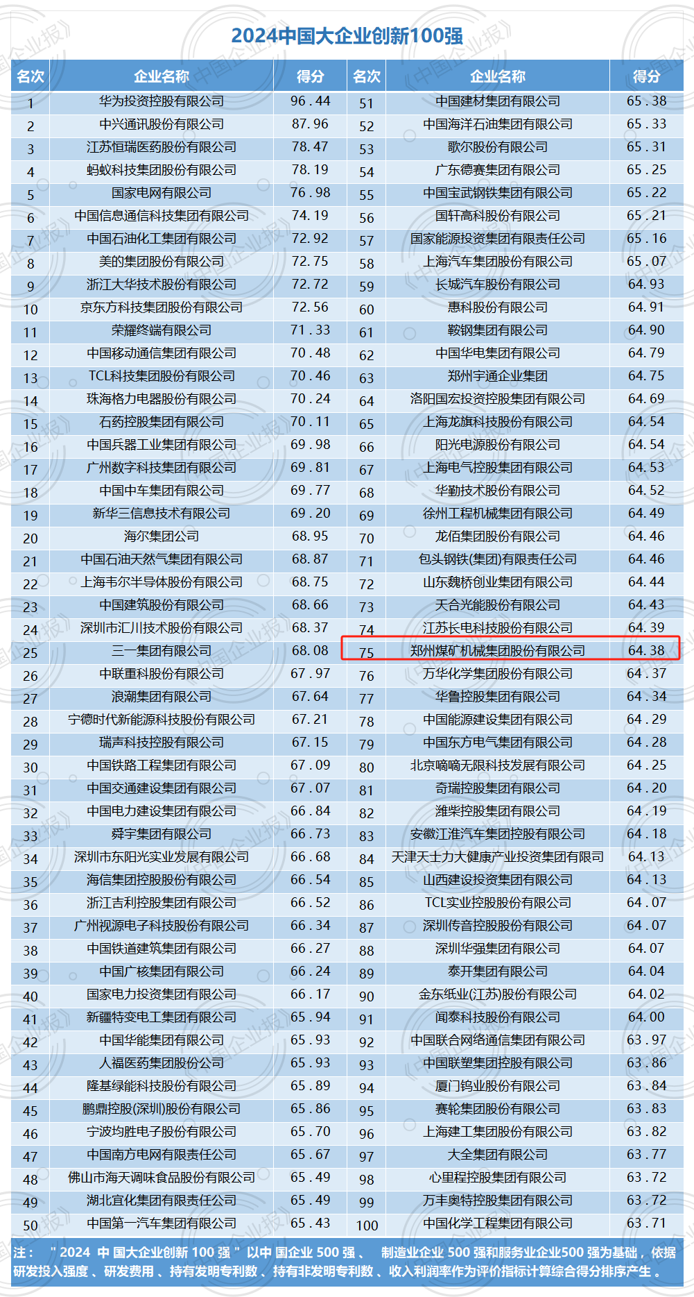 日前,中国企业联合会、中国企业家协会连续第4年推出“中国大企业创新100强”,郑煤机集团成功入选。