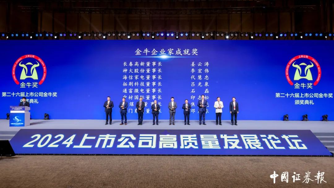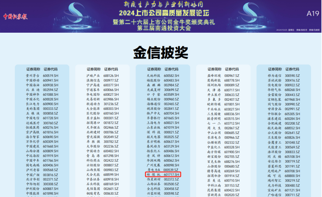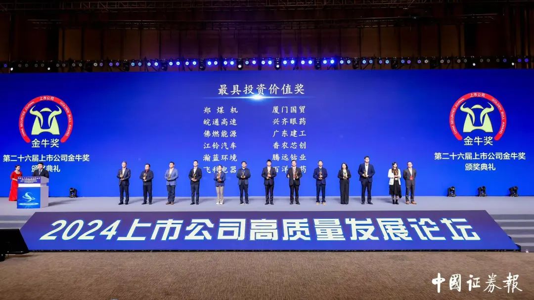 10月24日,由中国证券报与南通市人民政府携手举办的2024上市公司高质量发展论坛暨第二十六届上市公司金牛奖颁奖典礼在江苏南通举行。本次论坛以“新质生产力与产业创新协同”为主题,多位知名企业家、学者及投资人齐聚一堂,聚焦未来产业演进、因地制宜发展新质生产力,共同探讨上市公司高质量发展的新路径、新机遇。论坛发布了备受关注的年度金牛奖项,郑煤机集团党委书记、董事长焦承尧荣获金牛企业家成就奖,郑煤机集团荣获金牛最具投资价值奖及“金信披”奖。
