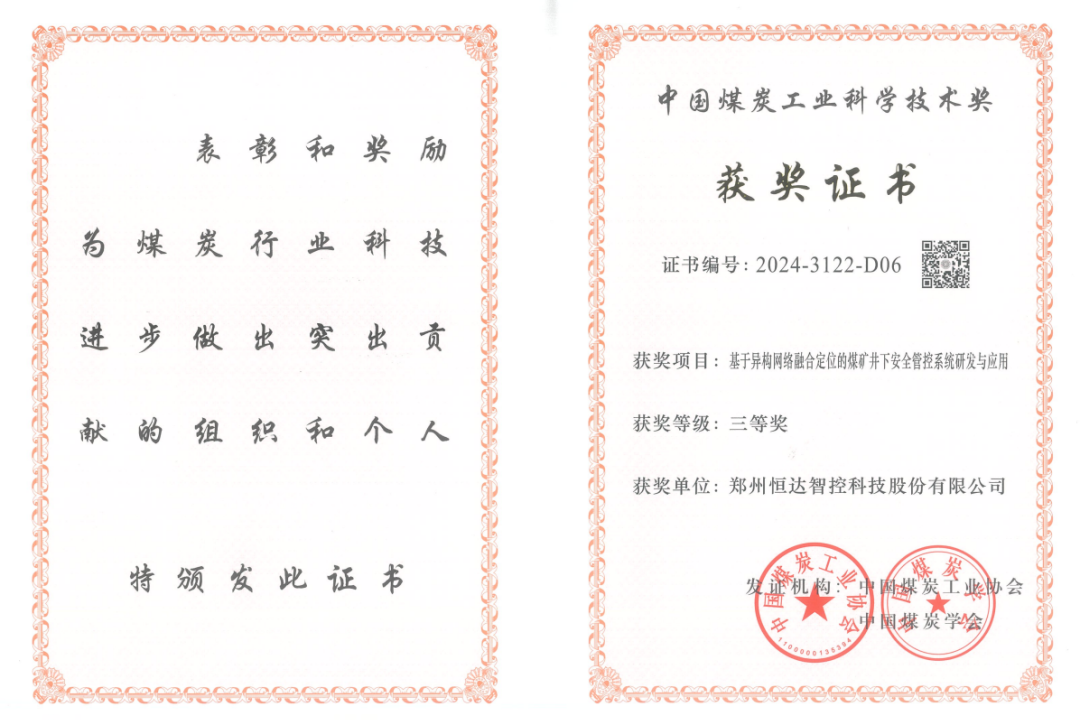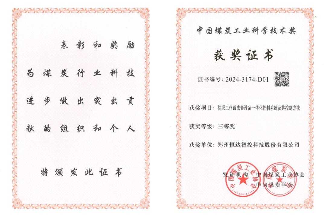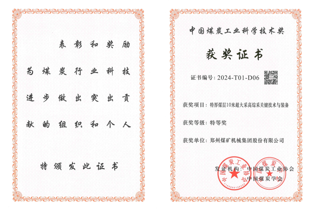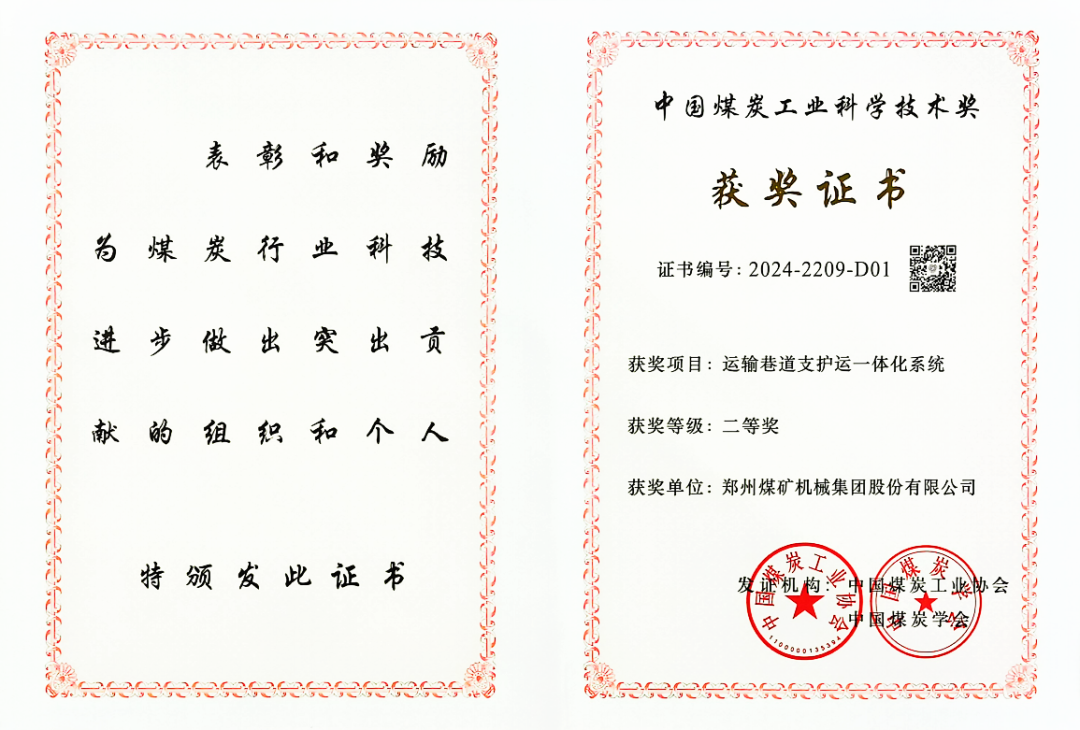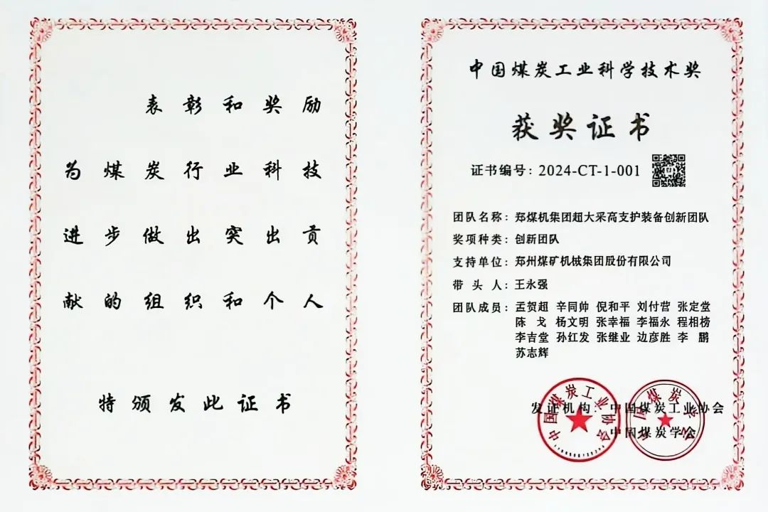 此外,郑煤机“运输巷道支护运一体化系统”荣获中国煤炭工业科学技术奖二等奖,郑煤机“超长综采充填关键技术及装备研发”“基于分布式控制的综采工作面智能化管控系统建设及应用项目”“基于异构网络融合定位的煤矿井下安全管控系统研发与应用”“综采工作面成套设备一体化控制系统及其控制方法”四个项目荣获中国煤炭工业科学技术奖三等奖。