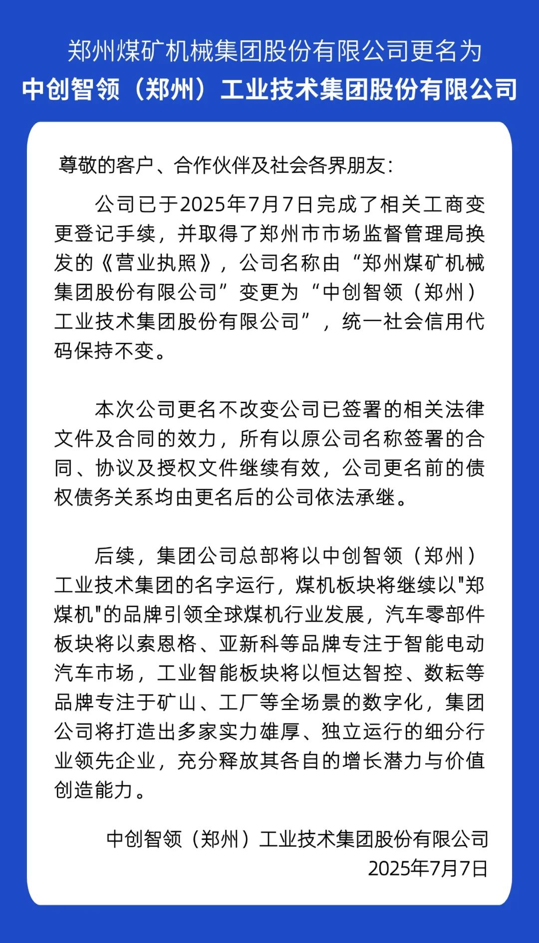 郑州煤矿机械集团股份有限公司更名为中创智领(郑州)工业技术集团股份有限公司