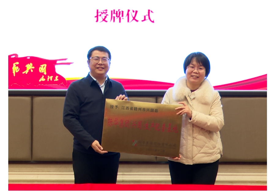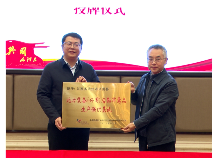 际华集团与县人民政府签署战略合作协议,际华集团、北方装备有限责任公司为县人民政府颁发“际华集团(兴国)生产配套基地”、“北方装备(兴国)后勤军需品生产保供基地”荣誉牌。