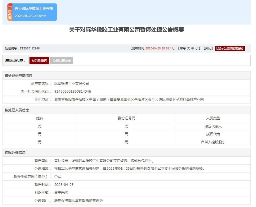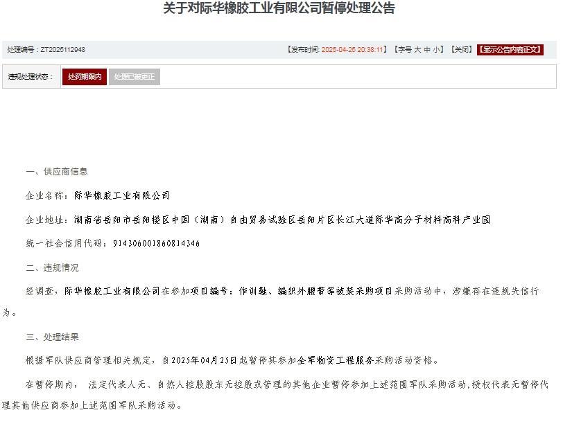 据悉,际华橡胶的处理结果为:根据军队供应商管理相关规定,自2025年4月25日起暂停其参加全军物资工程服务采购活动资格。暂停生效范围(单位)为全军,处理部门为联勤保障部队后勤部采购管理处。