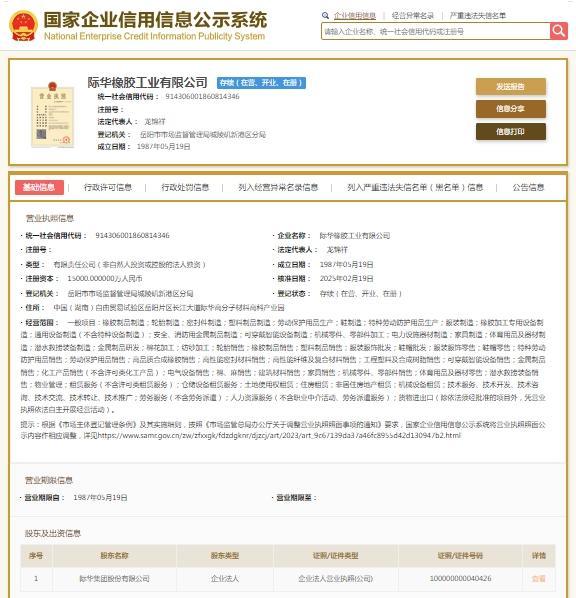 国家企业信用信息公示系统显示,际华橡胶工业有限公司成立于1987年,注册资本15000万元人民币,法定代表人龙锦祥,由际华集团股份有限公司全资持股。际华集团股份有限公司则成立于2006年,注册资本439162.9404万元,法定代表人夏前军。