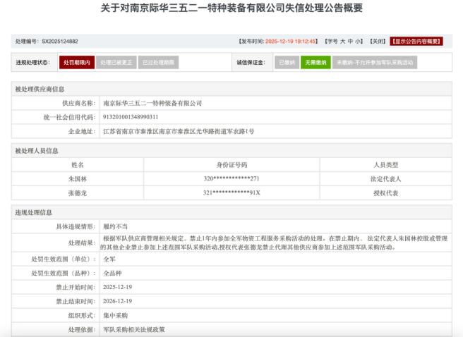 根据联勤保障部队采购管理部门发布的《关于对南京际华三五二一特种装备有限公司失信处理公告》(编号:SX2025124882)显示,经调查核实,南京际华三五二一特种装备有限公司在参加项目编号:2021-JQ05-W1343采购活动中,存在履约不当等违规行为。根据军队供应商管理相关规定,1年禁止南京际华三五二一特种装备有限公司全军物资工程服务采购活动的处罚。