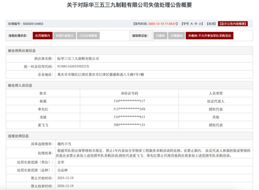 同日,同属于际华集团股份有限公司(际华集团601718.SH)的际华三五三九制鞋有限公司因在参加项目编号:2022-JQ01-W1491/W1520、项目编号:2017-ZHTJ-2056、项目编号:2020-WZ-LB05-2006采购活动中,存在履约不当等违规行为,被联勤保障部队采购管理部门禁止其1年内参与全军物资工程服务采购活动。