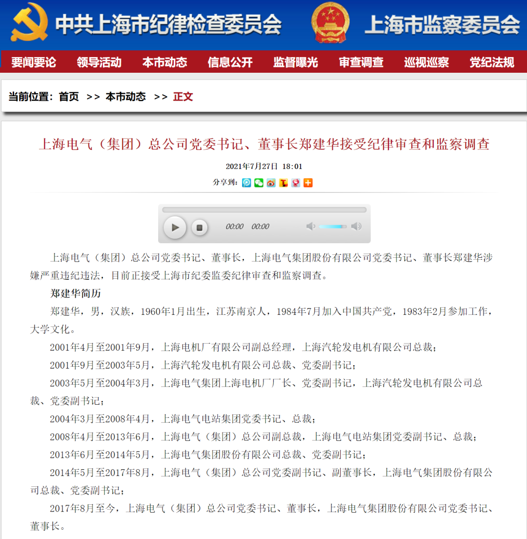 7月27日,根据中共上海市纪律检查委员会、上海市监察委员会网站消息,上海电气(集团)总公司党委书记、董事长,上海电气集团股份有限公司党委书记、董事长郑建华涉嫌严重违纪违法,目前正接受上海市纪委监委纪律审查和监察调查。