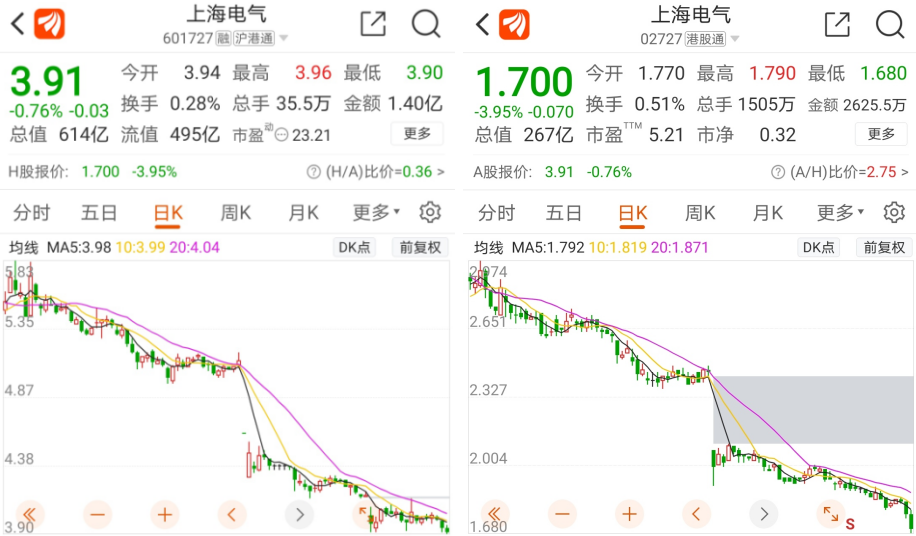 截至7月27日收盘,上海电气A股股价报3.91元/股,H股股价报1.7港元/股。自子公司业绩爆雷以来,其A股股价累计下跌23.03%,港股累计下跌30.02%,A、H股市值合计已蒸发近300亿人民币。