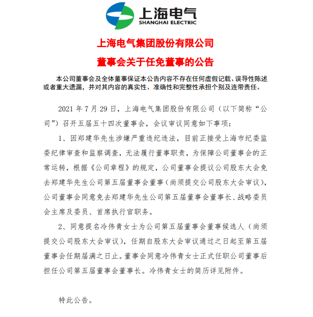 7月29日,上海电气(601727.SH)发布公告,公司于2021年7月29日召开了公司董事会五届五十四次会议。因郑建华涉嫌严重违纪违法,目前正接受上海市纪委监委纪律审查和监察调查,无法履行董事职责。为保障公司董事会的正常运转,现根据《公司章程》的规定,同意提议公司股东大会免去郑建华上海电气集团股份有限公司第五届董事会董事职务。本议案尚须提交股东大会审议。