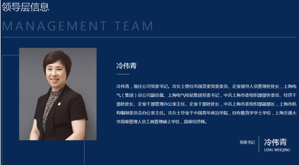 冷伟青女士,女,53 岁,上海市第十五届人大代表。冷伟青女士曾任上海市委组织部企干办助理调研员、经济干部处助理调研员、上海市国资委党委委员、上海市国资委党委领导人员管理处副处长、处长、上海电气(集团)总公司副总裁、上海电气电站集团党委书记、上海市委组织部部务委员、企业干部处处长、上海市委组织部副部长、上海市机构编制委员会办公室主任。冷伟青女士拥有教育学学士、高级管理人员工商管理硕士学位,高级经济师。