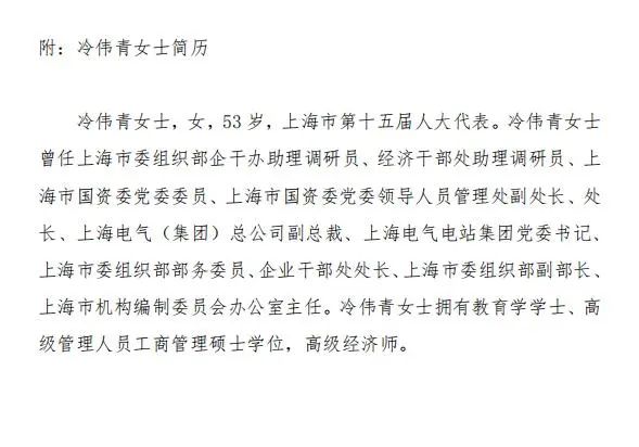冷伟青女士,女,53 岁,上海市第十五届人大代表。冷伟青女士曾任上海市委组织部企干办助理调研员、经济干部处助理调研员、上海市国资委党委委员、上海市国资委党委领导人员管理处副处长、处长、上海电气(集团)总公司副总裁、上海电气电站集团党委书记、上海市委组织部部务委员、企业干部处处长、上海市委组织部副部长、上海市机构编制委员会办公室主任。冷伟青女士拥有教育学学士、高级管理人员工商管理硕士学位,高级经济师。